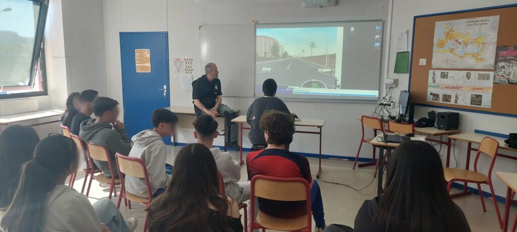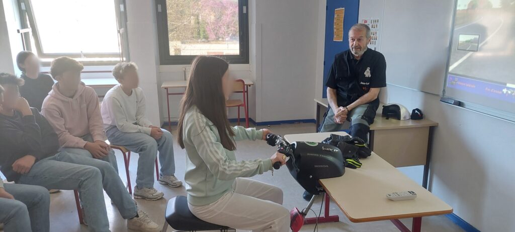 Ce lundi 07/04, Jean-Louis et Jean-Pierre (animateurs ERJ de la FFMC46) sont intervenus dans des classes de 3 eme du collège Jean Lurçat à St Céré. Les 86 élèves présents sur quatre sessions se sont prêtés au jeu des questions-réponses portant sur la compréhension des causes et effets dans le domaine de la sécurité routière. Le simulateur a eu un succès mitigé mais réel.