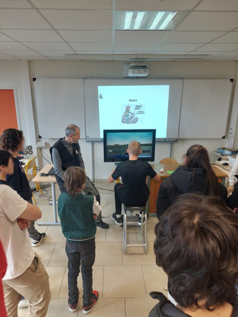Ce lundi 25/03, les animateurs de la FFMC46 (Jean Pierre et Jean-Louis) sont intervenus dans un regroupement de classes de 3 eme et 5 eme SEGPA du collège Masbou à Figeac. 13 élèves présents ont pu écouter les conseils et informations données par les 2 intervenants mais c’est le simulateur de conduite qui les a vraiment intéressés.