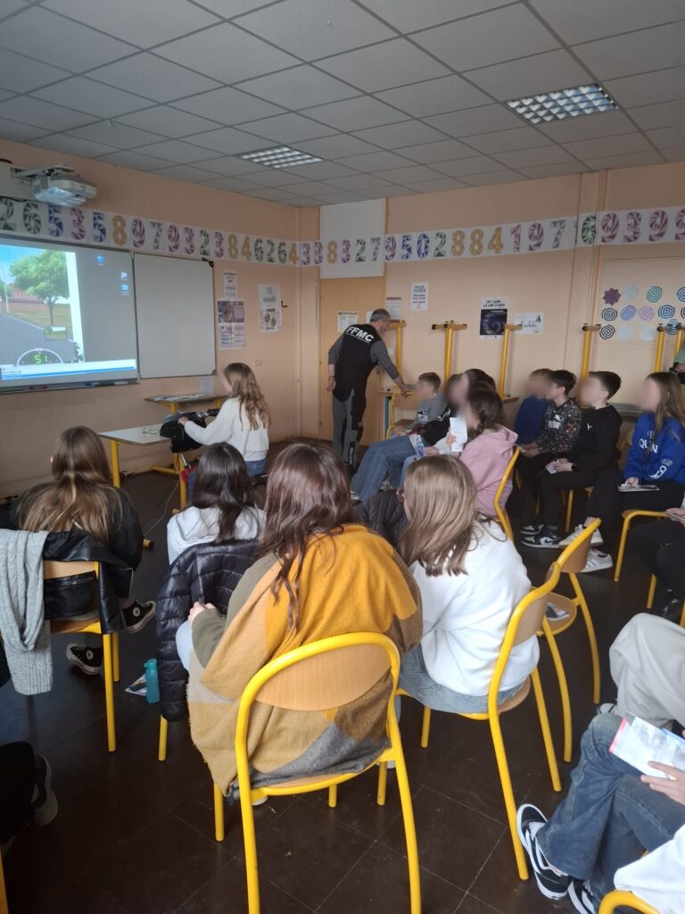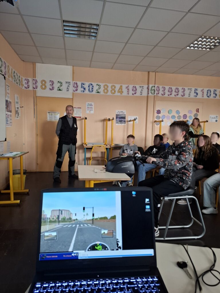 Ce vendredi 21/03, les animateurs de la FFMC46 (Thierry, Jean-Louis accompagnés de Stéphanie) sont intervenus dans des classes de 5 -ème du collège M.Masbou à Figeac où les 90 élèves présents sur quatre sessions ont pu échanger de manière interactive sur la sécurité routière et sur le partage de la route en 2RM. La partie théorique a été complétée par la mise en pratique sur un simulateur de conduite 2RM.