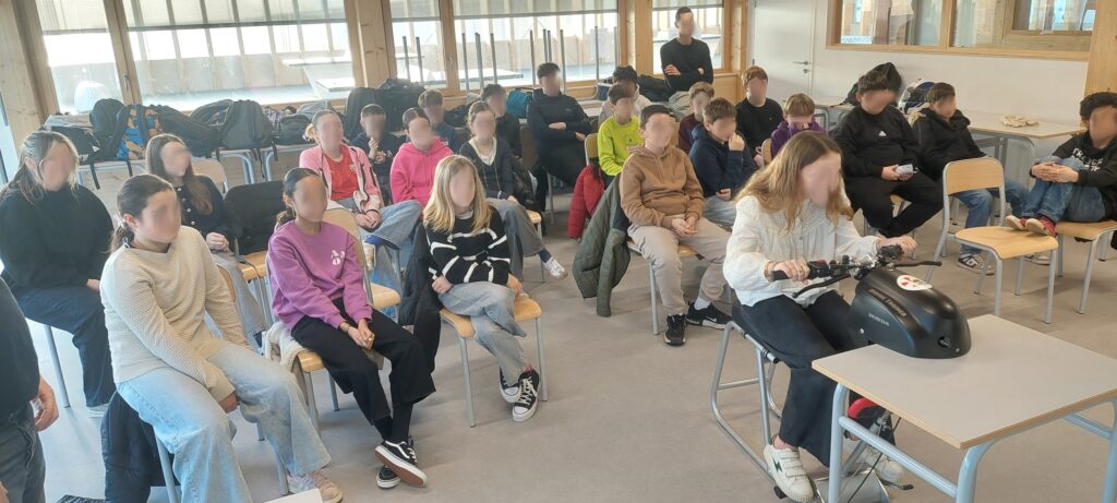 Les 23 élèves de 5 eme se sont montrés très concernés par les échanges avec les animateurs et par les informations concrètes diffusées pendant la séance. La mise en pratique sur simulateur de conduite 2 roues motorisées a permis de mettre en valeur les notions de prise de risque, d’excès de confiance et les comportements routiers associés.