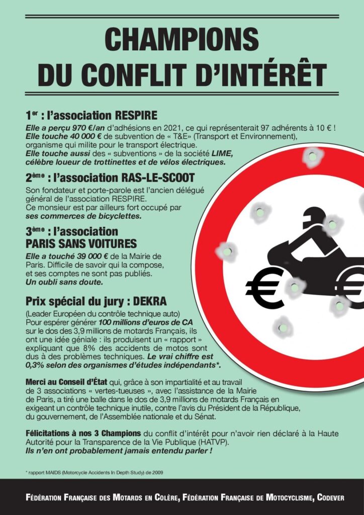 Nous manifesterons contre les associations anti-motos, qui vivent de nos impôts grâce aux subventions qui leur sont versées, dont les dirigeants agissent par intérêt politique et financier, et veulent nous imposer leur idéologie totalitaire.